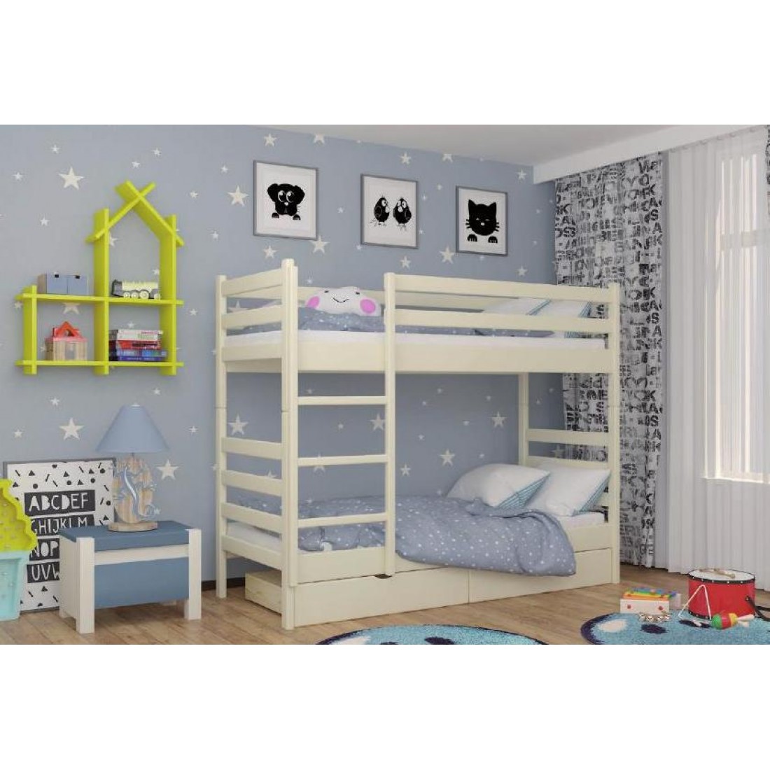 Двухэтажная конструкция кровати позволяет вам экономить место в комнате и дает возможность разместить двух детей в одной комнате. Кровать имеет лестницу, которая обеспечивает безопасный подъем на верхний ярус.