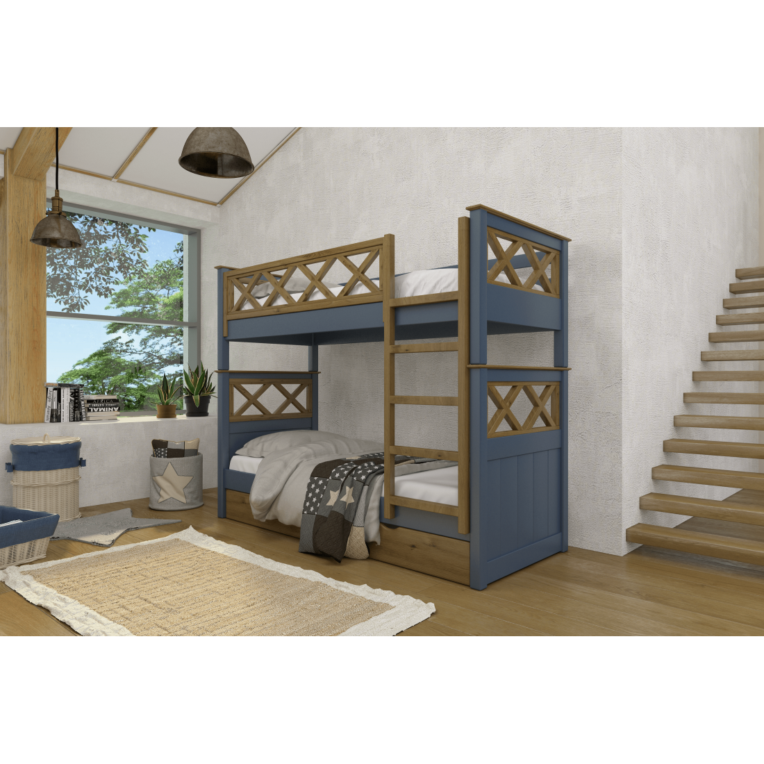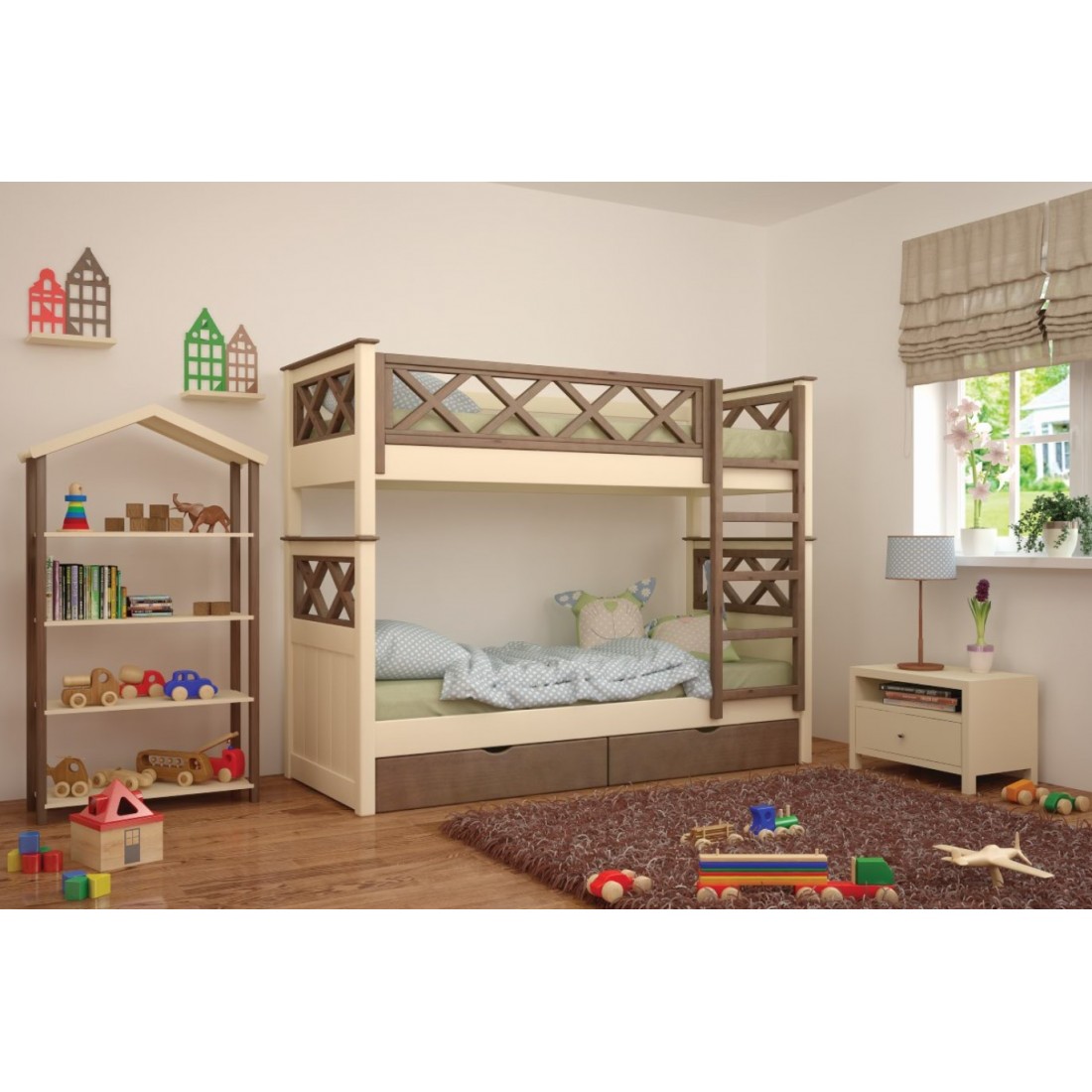 Двухэтажная конструкция кровати позволяет вам экономить место в комнате и дает возможность разместить двух детей в одной комнате. Кровать имеет лестницу, которая обеспечивает безопасный подъем на верхний ярус.